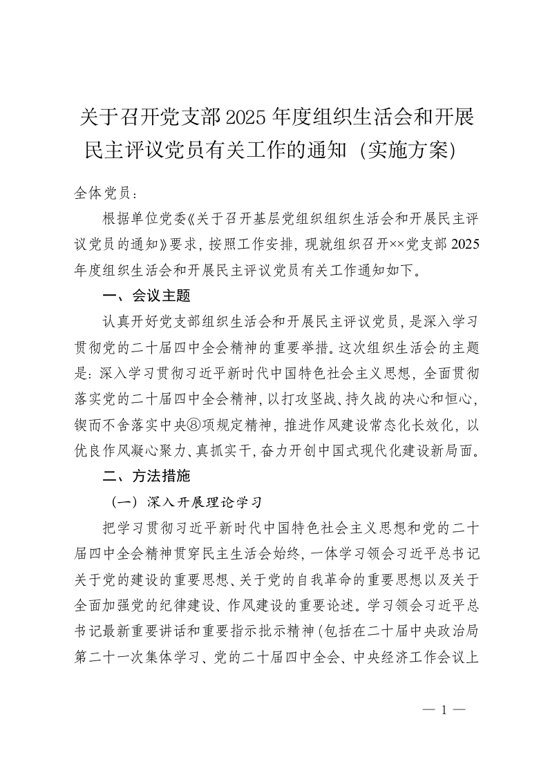 关于召开党支部2025年度组织生活会和开展民主评议党员有关工作的通知(实施方案)