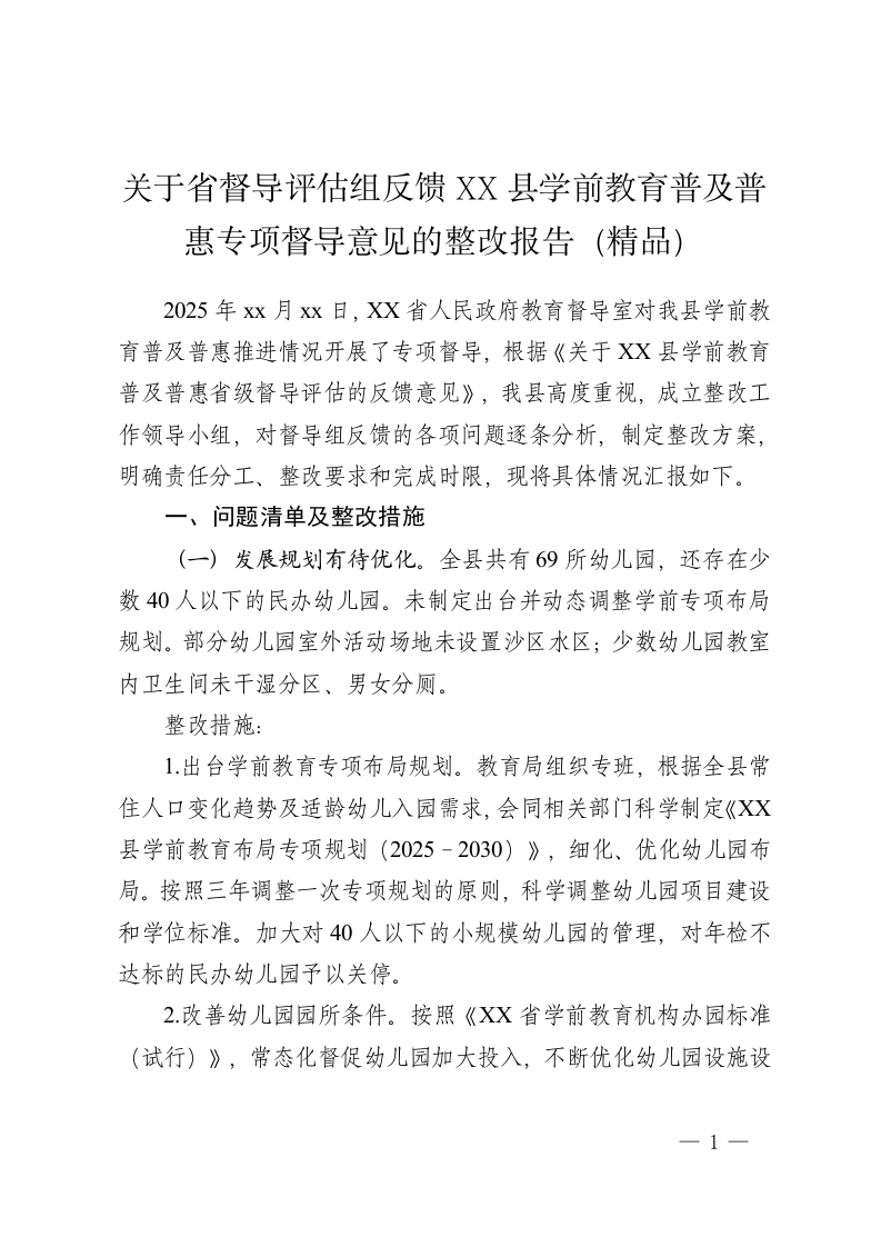 关于省督导评估组反馈XX县学前教育普及普惠专项督导意见的整改报告(精品)