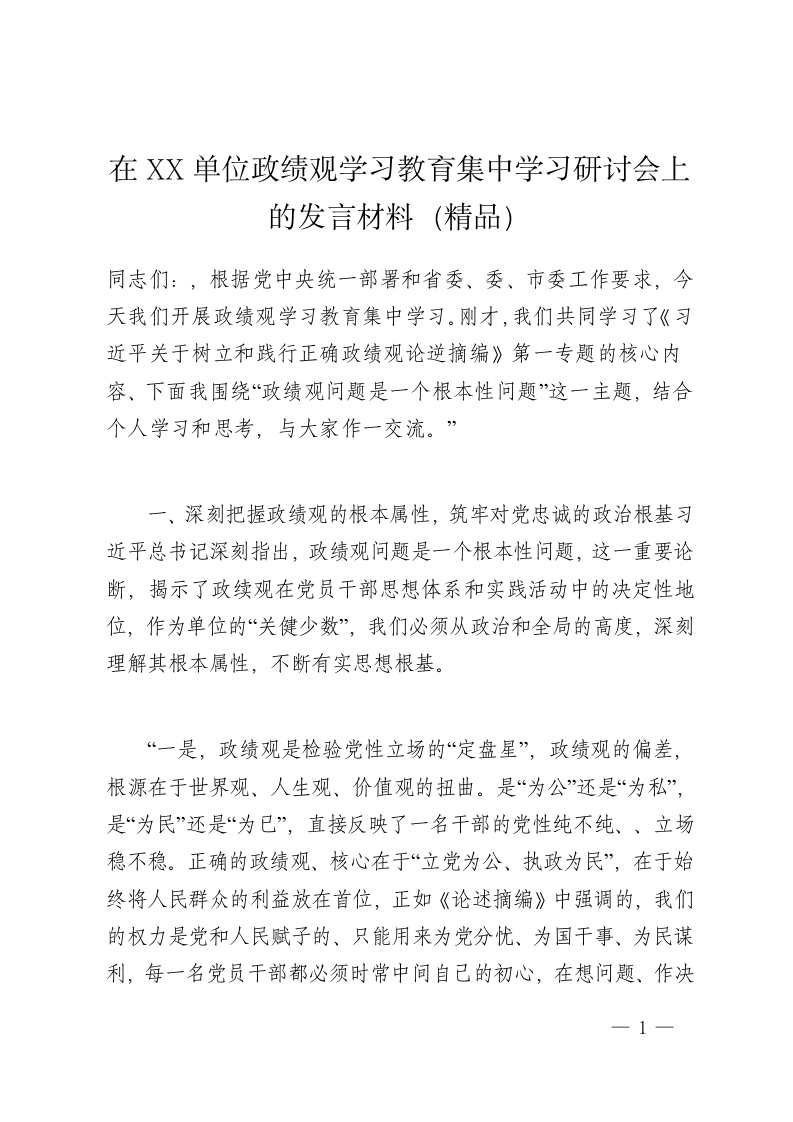 在XX单位政绩观学习教育集中学习研讨会上的发言材料(精品)