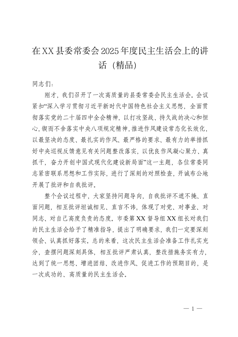 在XX县委常委会2025年度民主生活会上的讲话(精品)