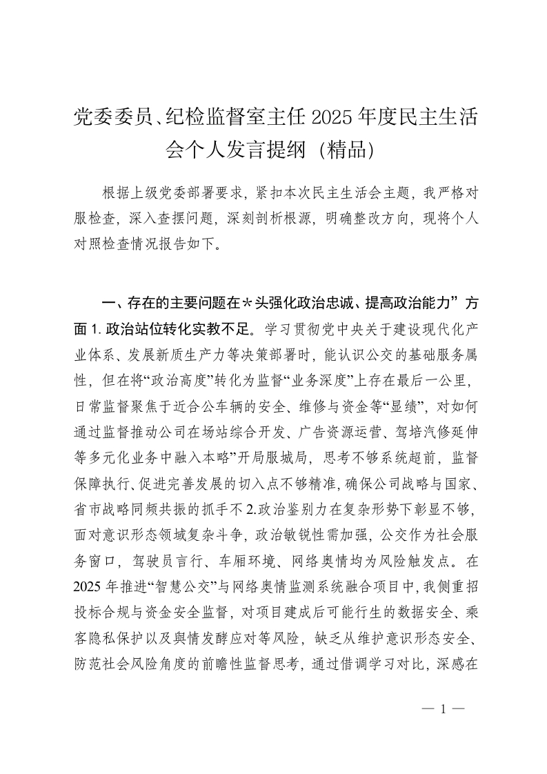 首页公文大全民主生活会党委委员、纪检监督室主任2025年度民主生活会个人发言提纲(精品)