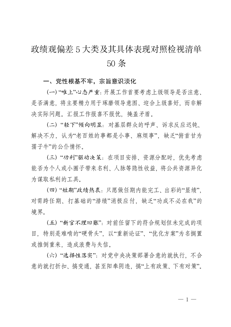 政绩观偏差5大类及其具体表现对照检视清单50条