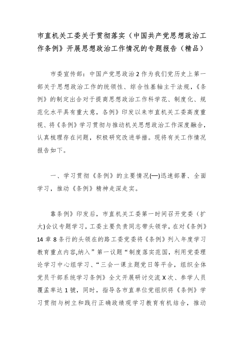 市直机关工委关于贯彻落实(中国共产党思想政治工作条例》开展思想政治工作情况的专题报告(精品)
