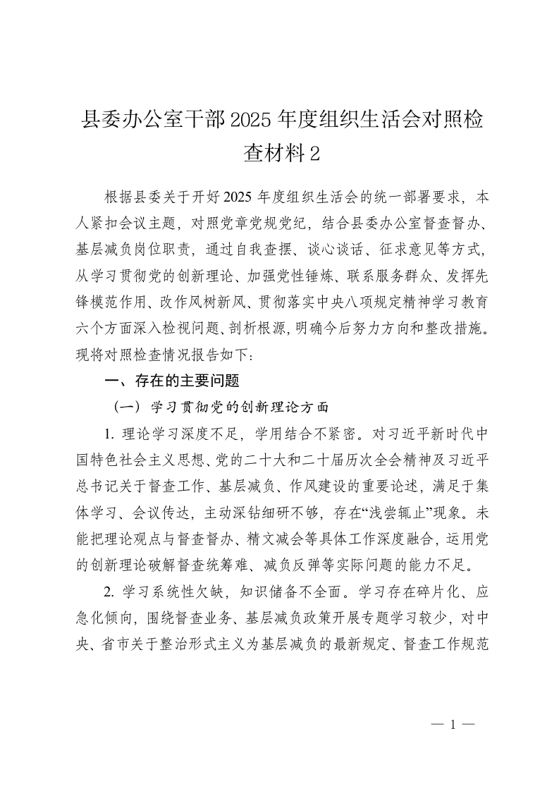 首页公文大全组织生活会县委办公室干部2025年度组织生活会对照检查材料2