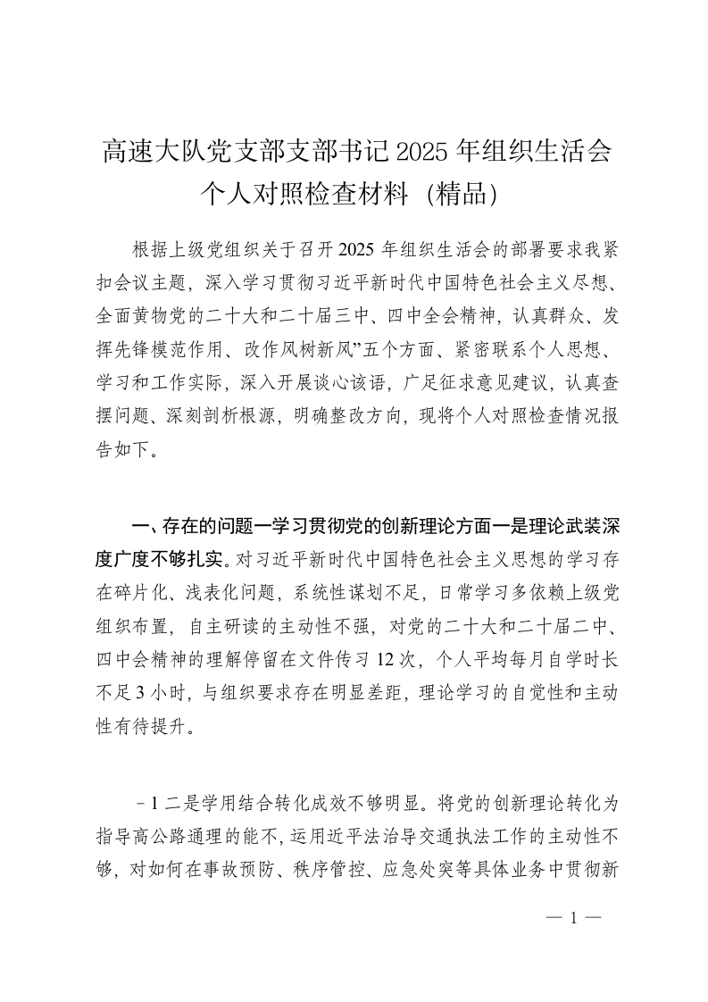 高速大队党支部支部书记2025年组织生活会个人对照检查材料(精品)