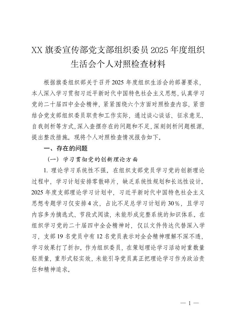 XX旗委宣传部党支部组织委员2025年度组织生活会个人对照检查材料