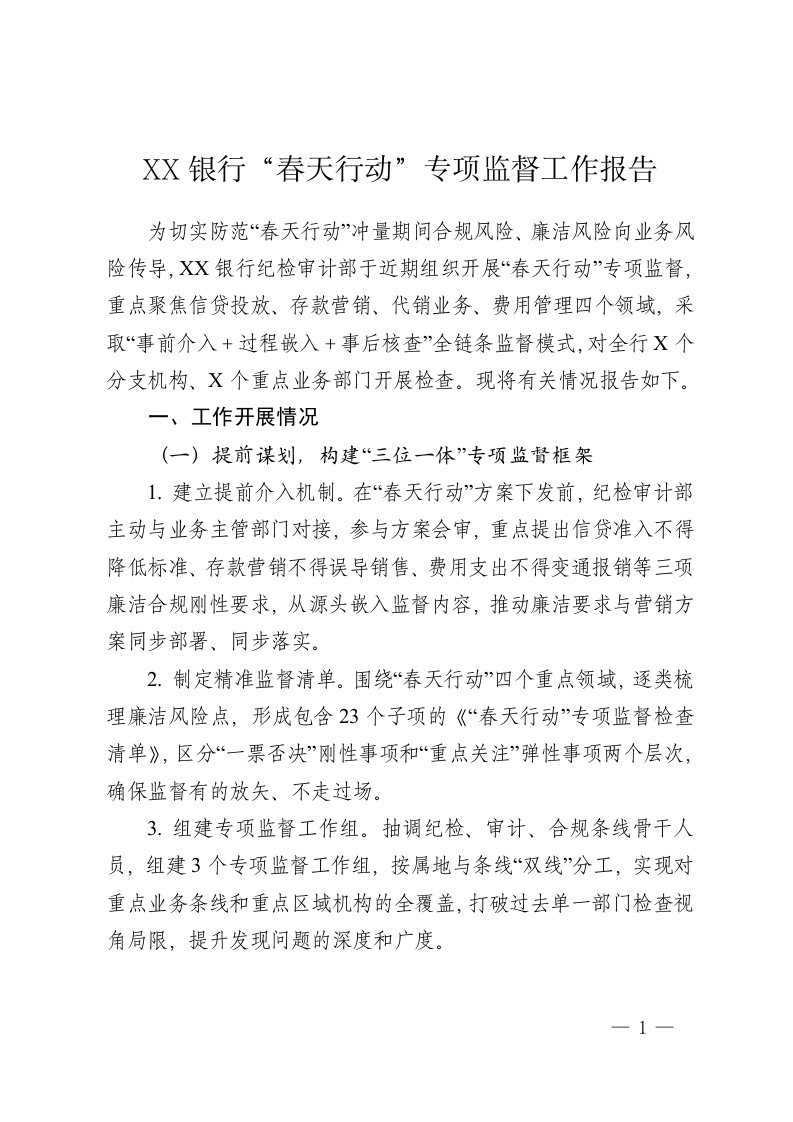 XX银行“春天行动”专项监督工作报告