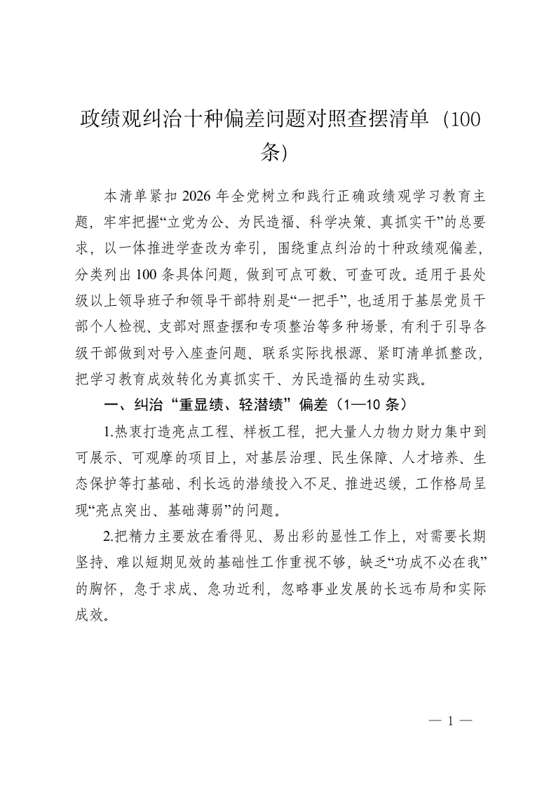 政绩观纠治十种偏差问题对照查摆清单(100条)