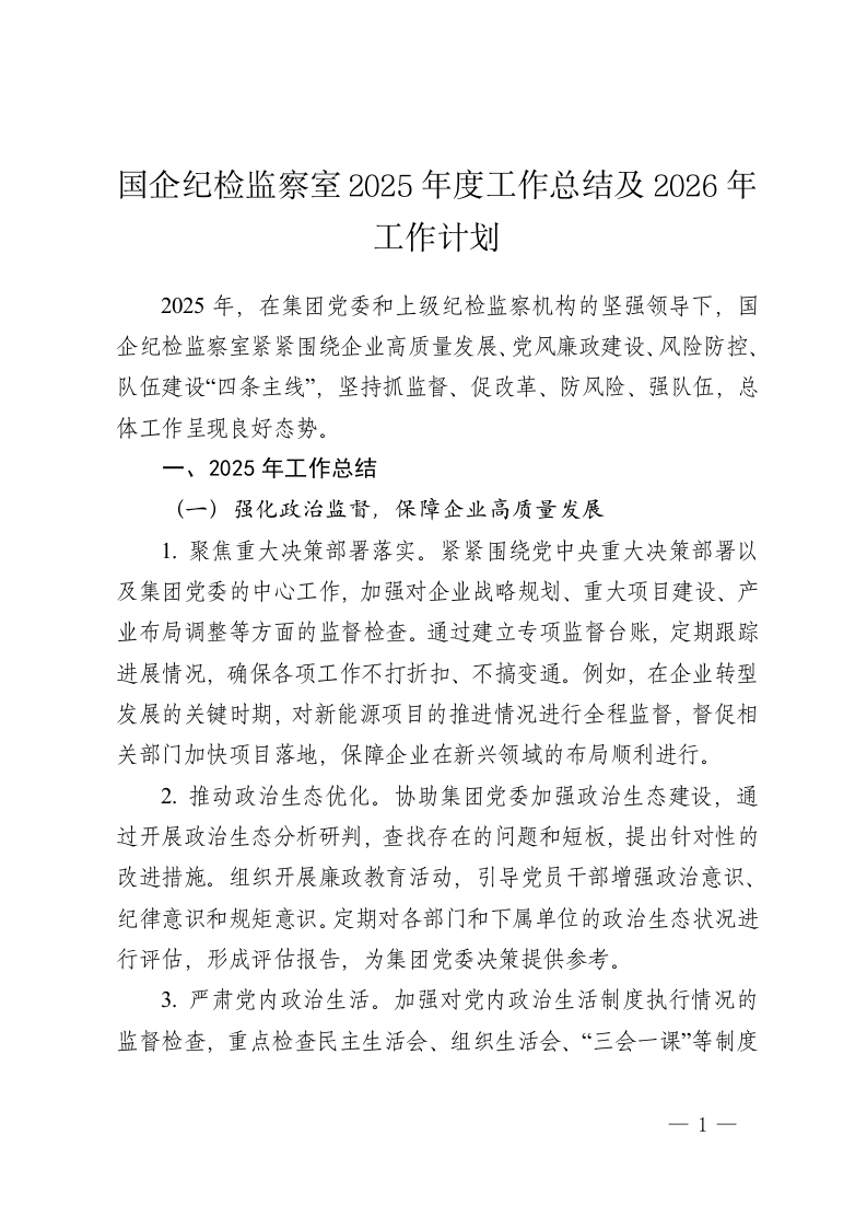国企纪检监察室2025年度工作总结及2026年工作计划