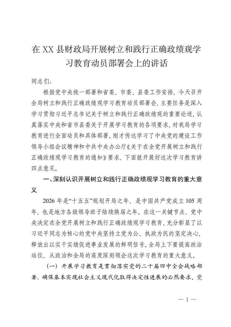 在XX县财政局开展树立和践行正确政绩观学习教育动员部署会上的讲话