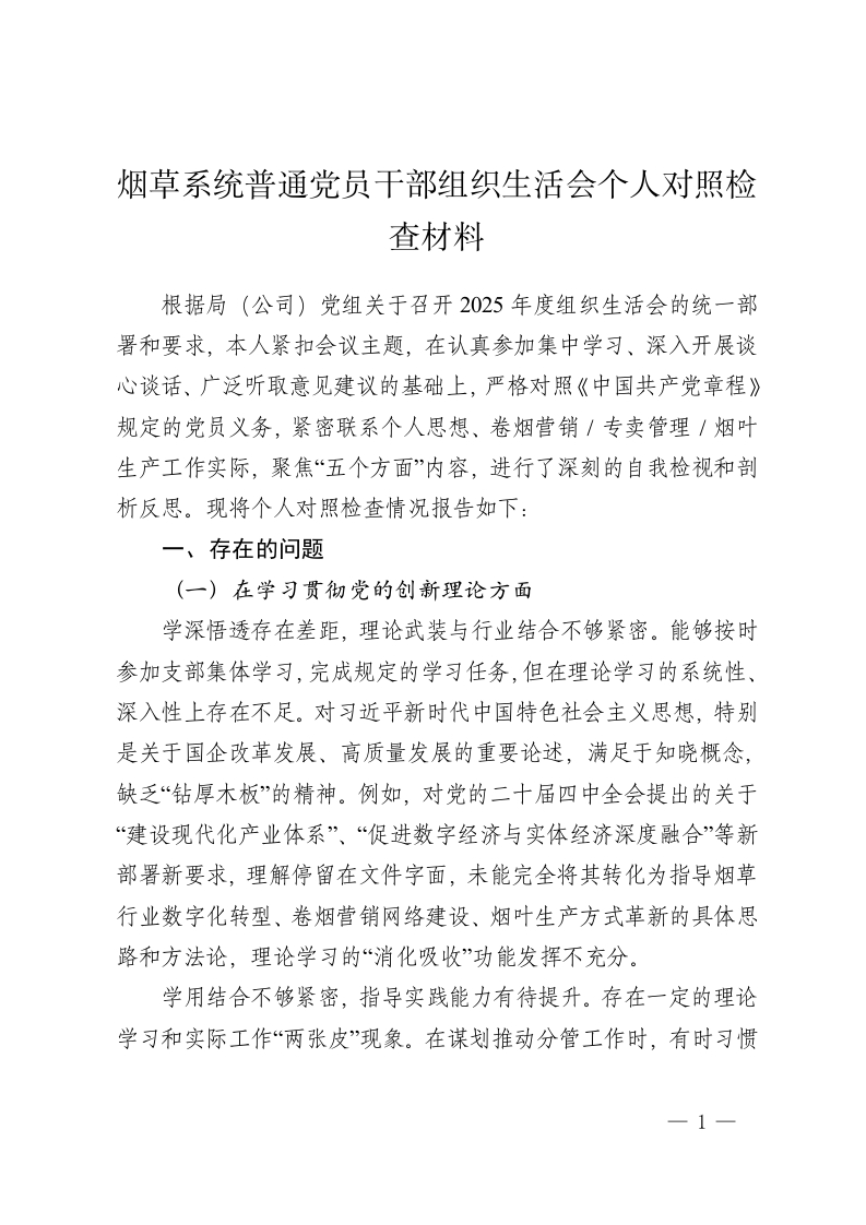 烟草系统普通党员干部组织生活会个人对照检查材料