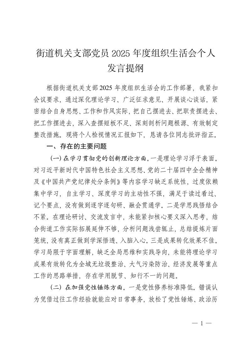 街道机关支部党员2025年度组织生活会个人发言提纲