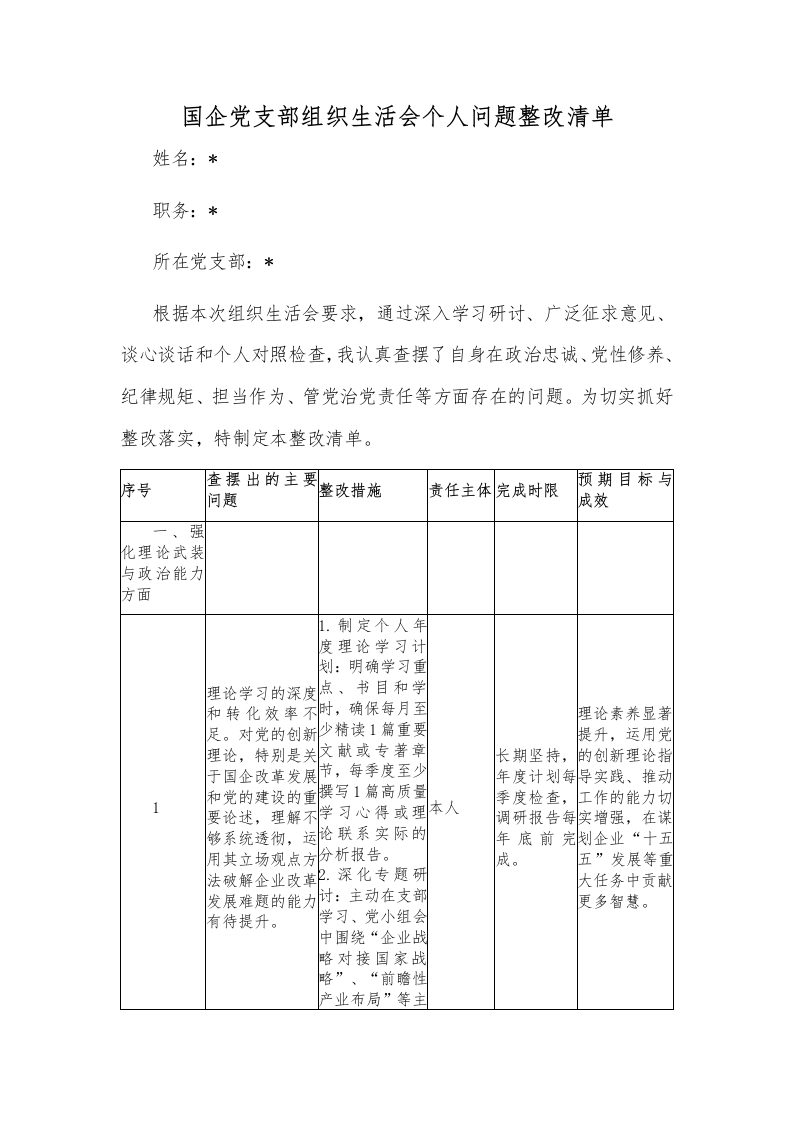 国企党支部组织生活会个人问题整改清单