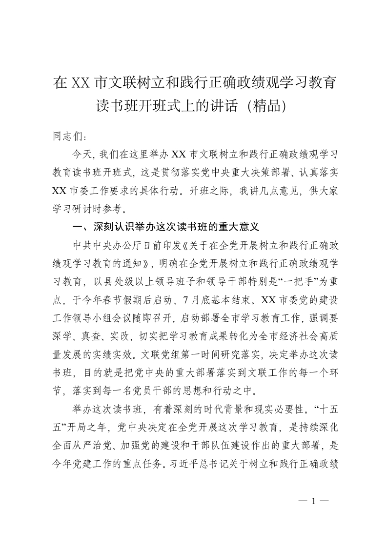 在XX市文联树立和践行正确政绩观学习教育读书班开班式上的讲话(精品)