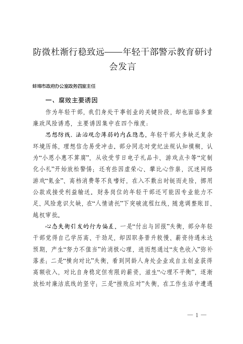 防微杜渐行稳致远——年轻干部警示教育研讨会发言