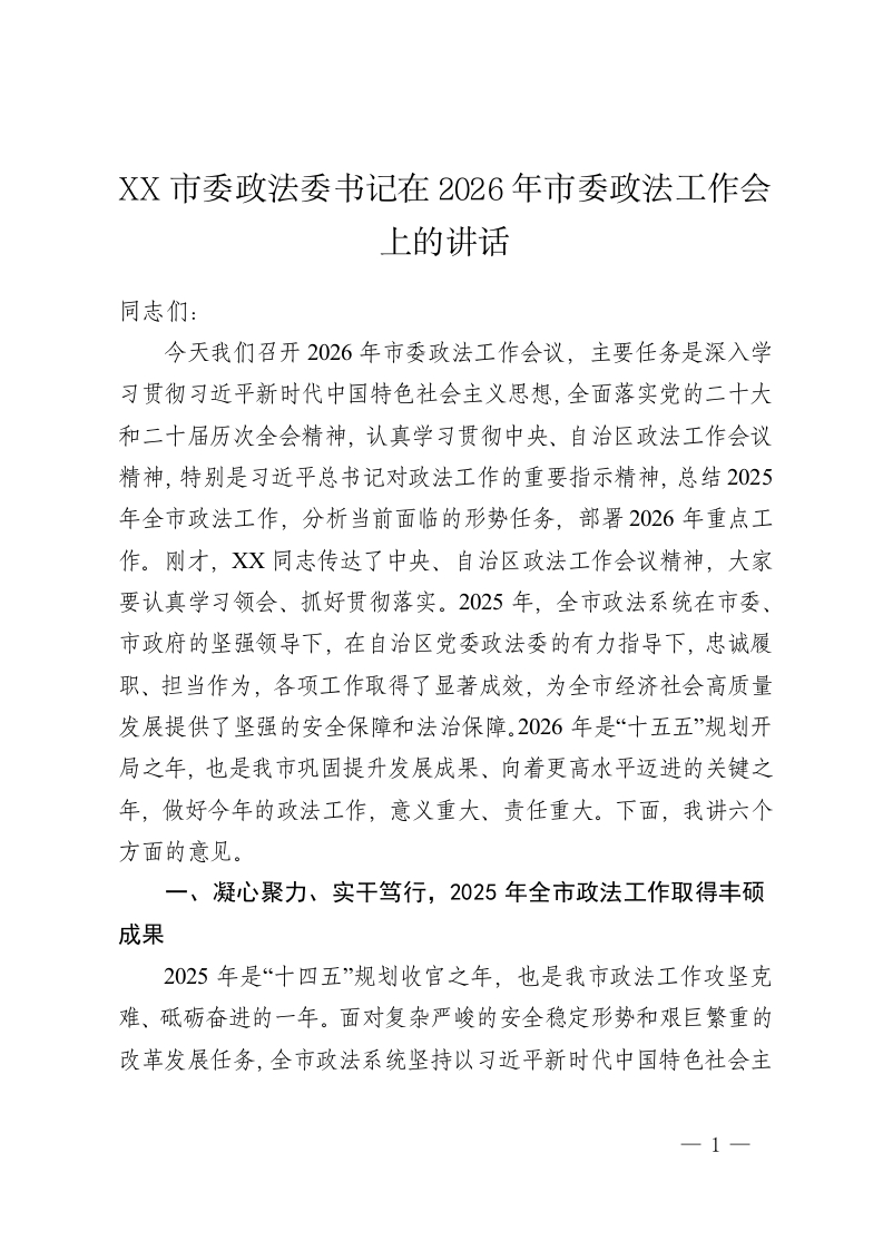 XX市委政法委书记在2026年市委政法工作会上的讲话