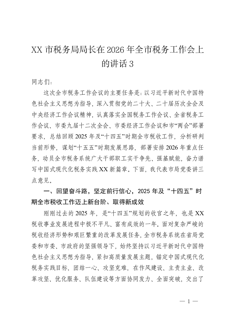 XX市税务局局长在2026年全市税务工作会上的讲话3