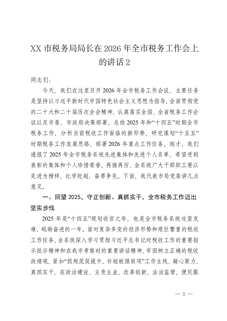 XX市税务局局长在2026年全市税务工作会上的讲话2