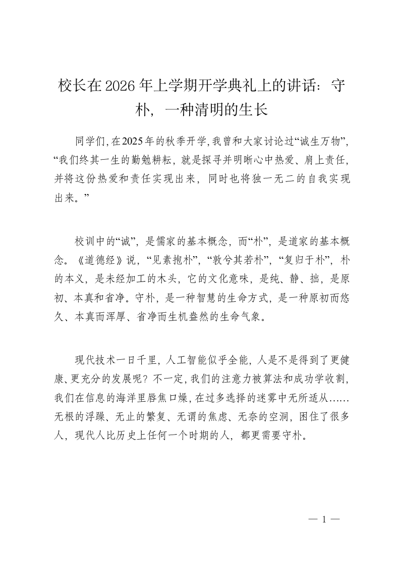 校长在2026年上学期开学典礼上的讲话:守朴,一种清明的生长