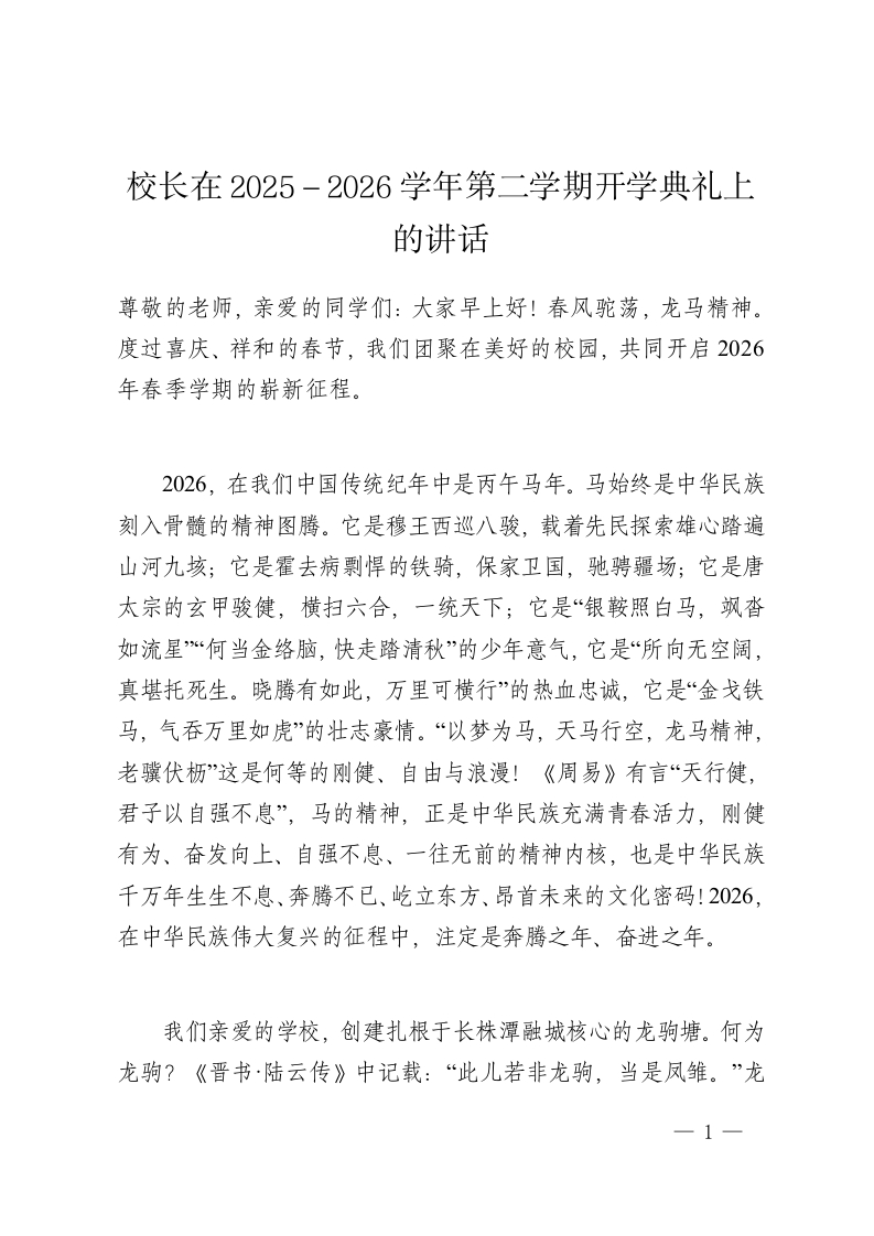 校长在2025-2026学年第二学期开学典礼上的讲话