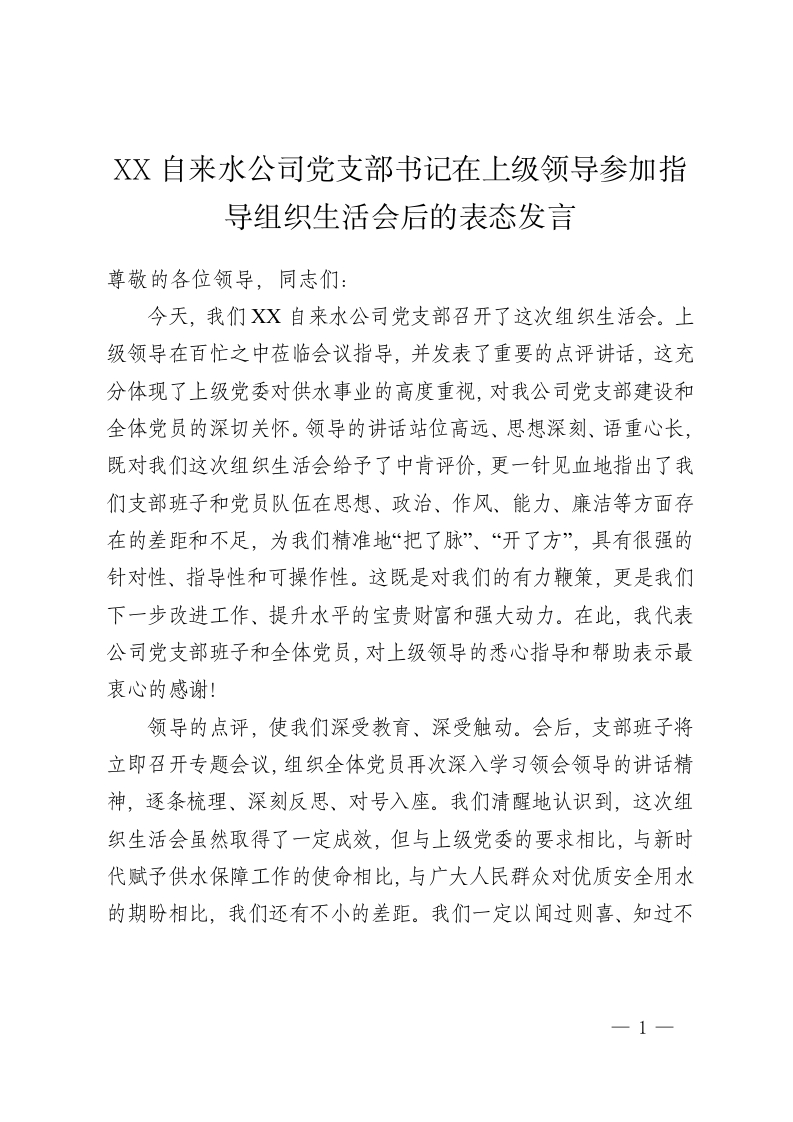 XX自来水公司党支部书记在上级领导参加指导组织生活会后的表态发言