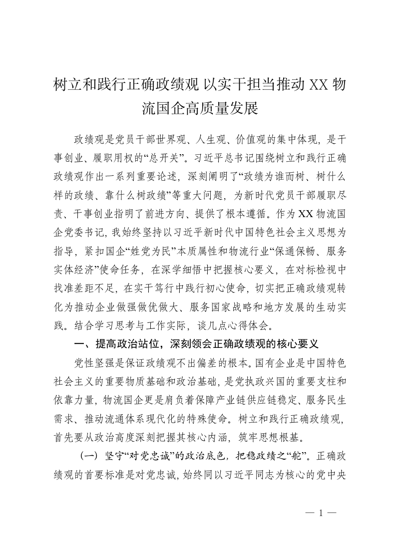 树立和践行正确政绩观 以实干担当推动XX物流国企高质量发展