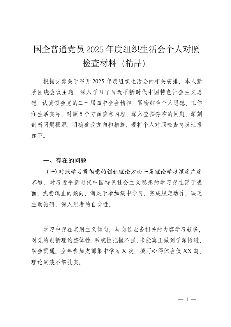 首页公文大全组织生活会国企普通党员2025年度组织生活会个人对照检査材料(精品)