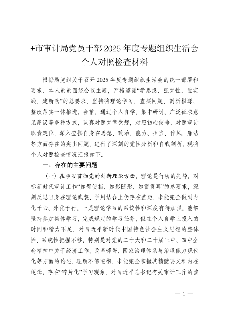 市审计局党员干部2025年度专题组织生活会个人对照检查材料