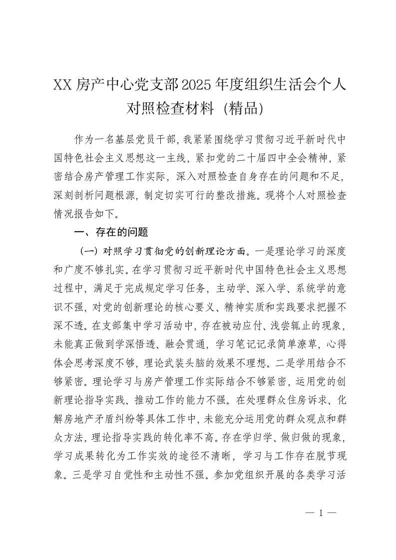 XX房产中心党支部2025年度组织生活会个人对照检查材料(精品)