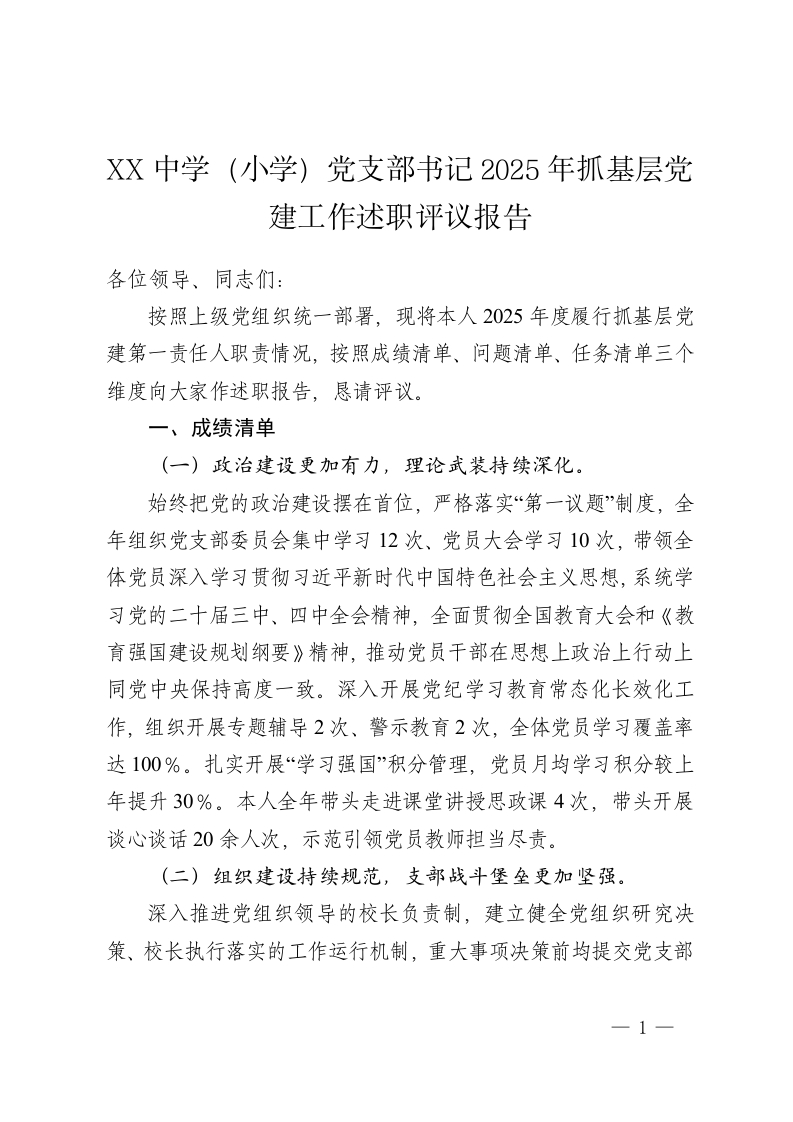 XX中学(小学)党支部书记2025年抓基层党建工作述职评议报告