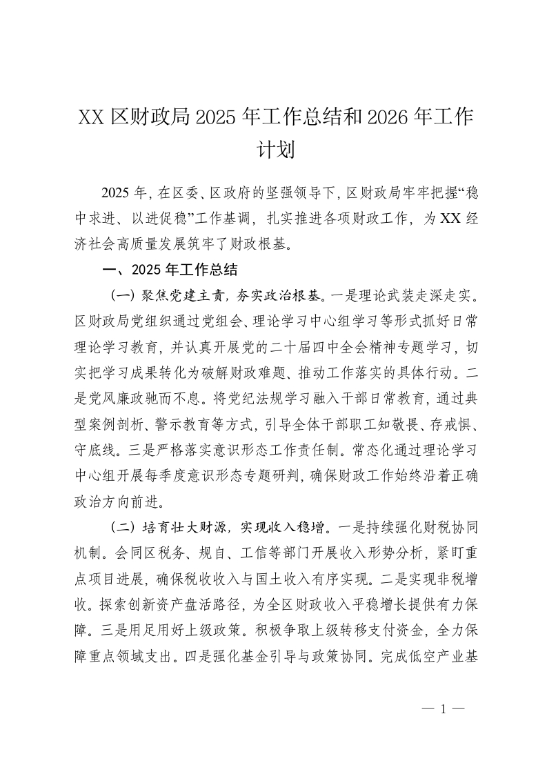 XX区财政局2025年工作总结和2026年工作计划