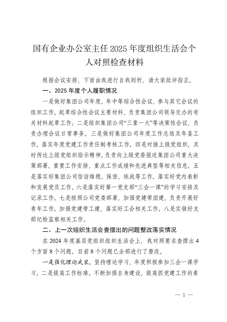 国有企业办公室主任2025年度组织生活会个人对照检查材料