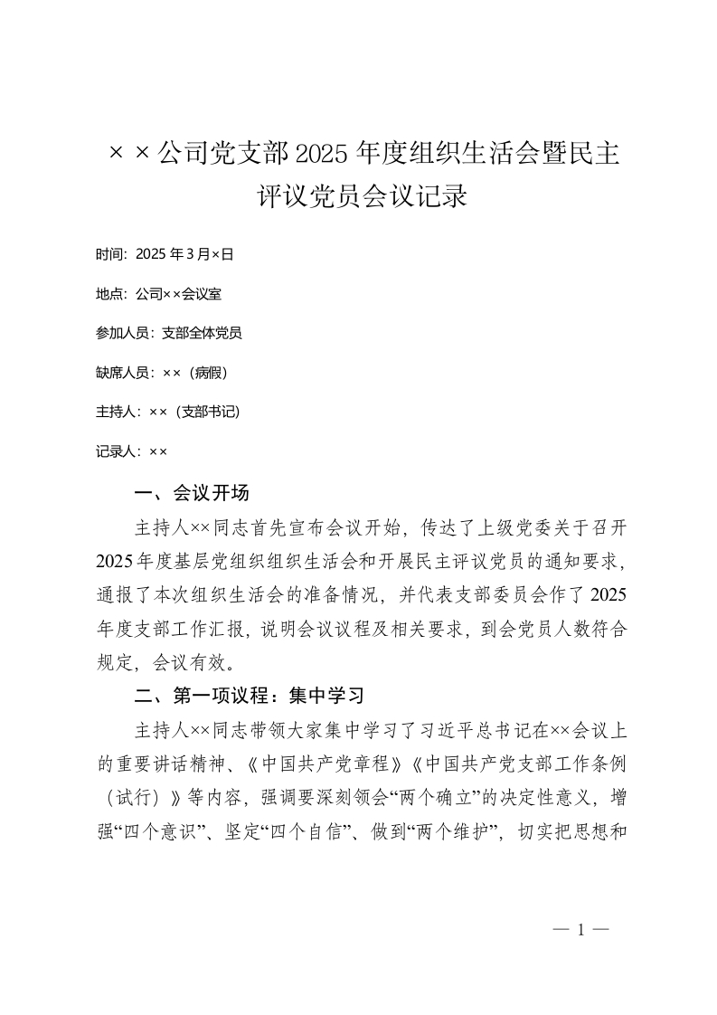 ××公司党支部2025年度组织生活会暨民主评议党员会议记录