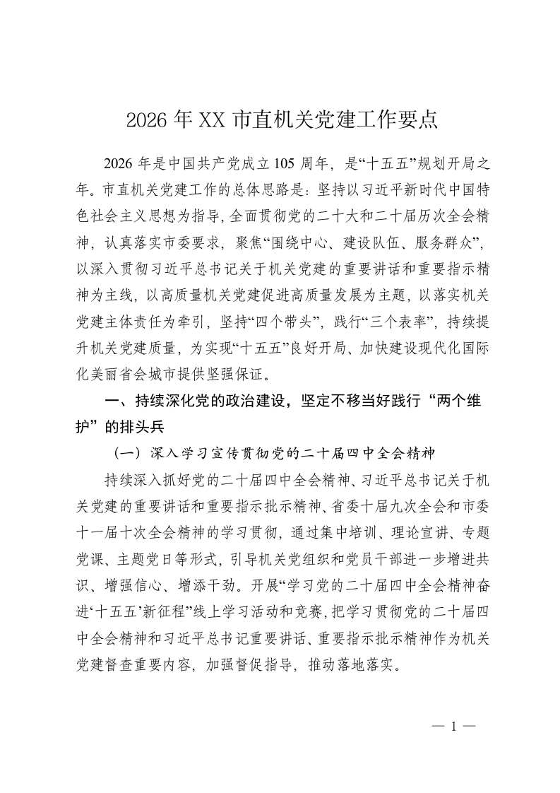 2026年XX市直机关党建工作要点