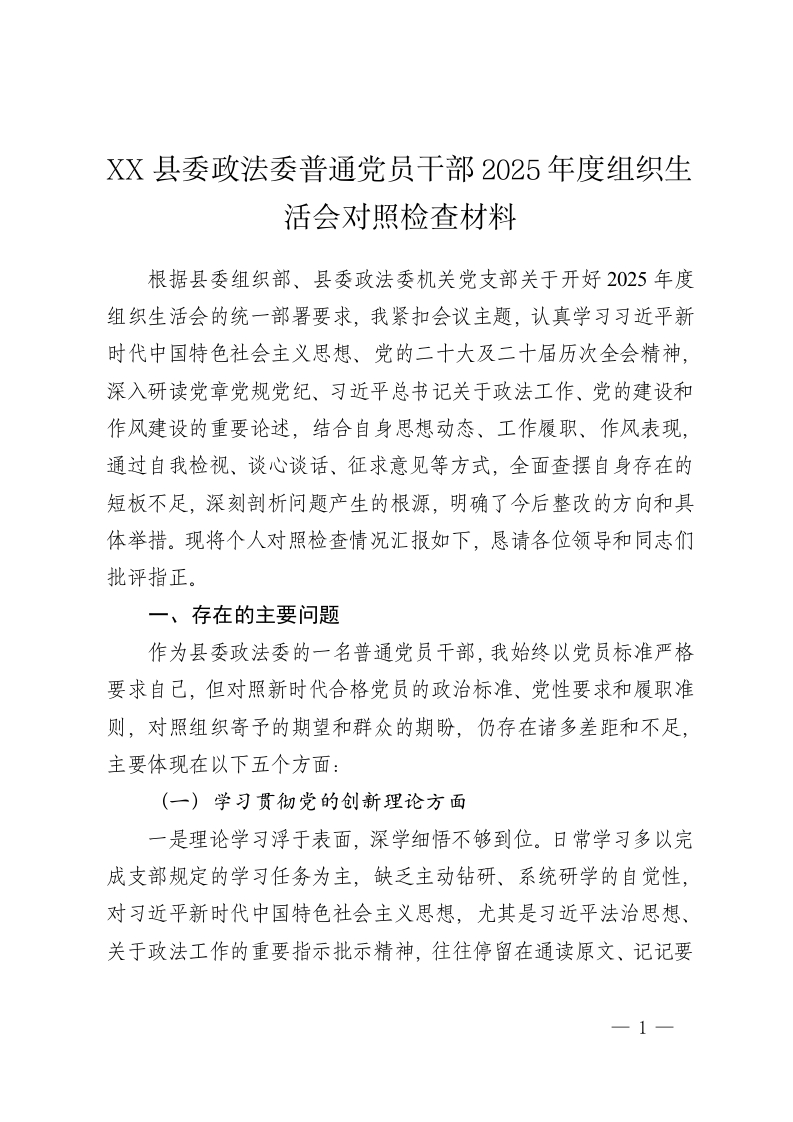 XX县委政法委普通党员干部2025年度组织生活会对照检查材料2
