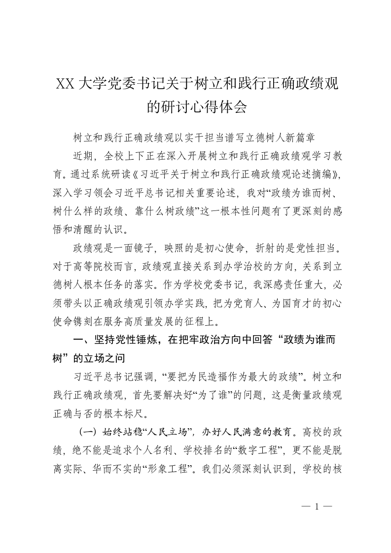 XX大学党委书记关于树立和践行正确政绩观的研讨心得体会