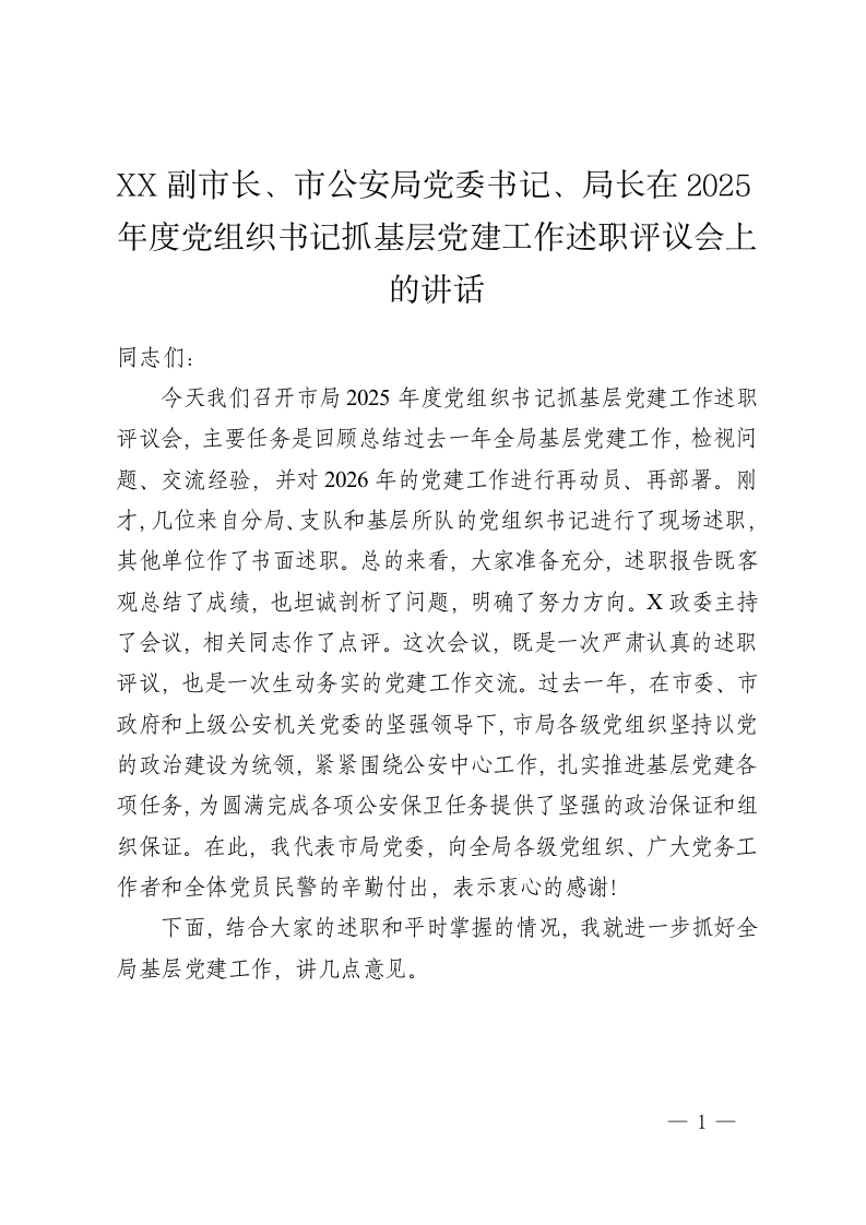 XX副市长、市公安局党委书记、局长在2025年度党组织书记抓基层党建工作述职评议会上的讲话