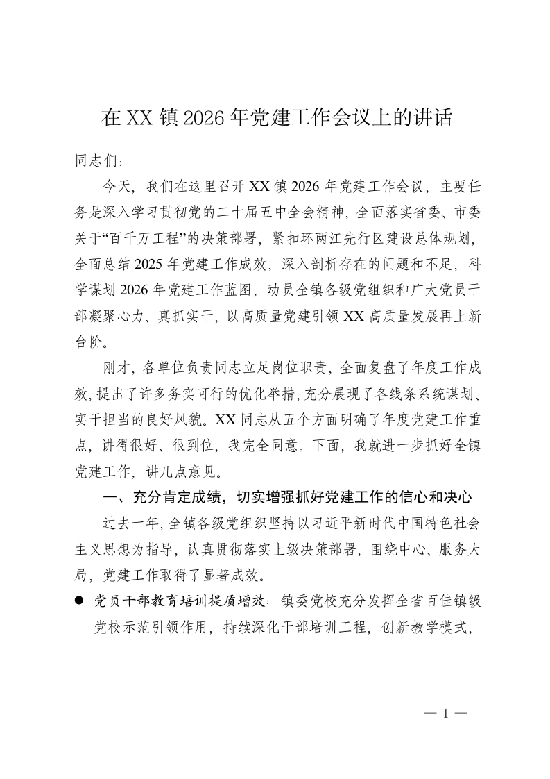 在XX镇2026年党建工作会议上的讲话