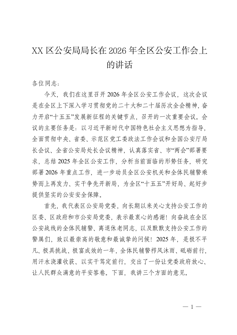 XX区公安局局长在2026年全区公安工作会上的讲话