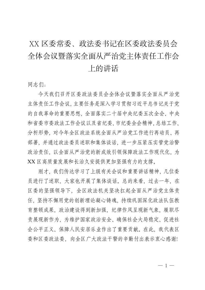 XX区委常委、政法委书记在区委政法委员会全体会议暨落实全面从严治党主体责任工作会上的讲话2